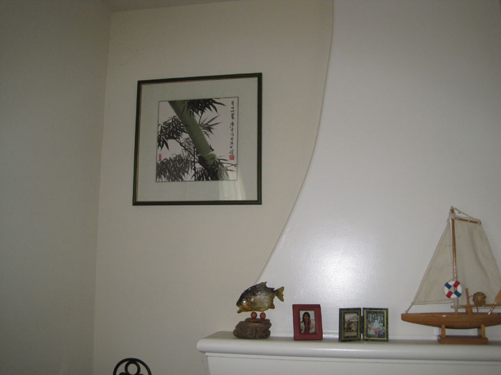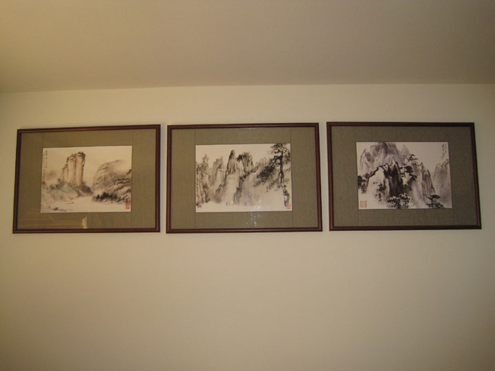 这是在客厅的。 左手边是国画大师欧豪年的画,中间是卢培钧(桂林书法家)的字,10年前花750刀(连字带框)在LA买的。右手边是便宜的工艺品。