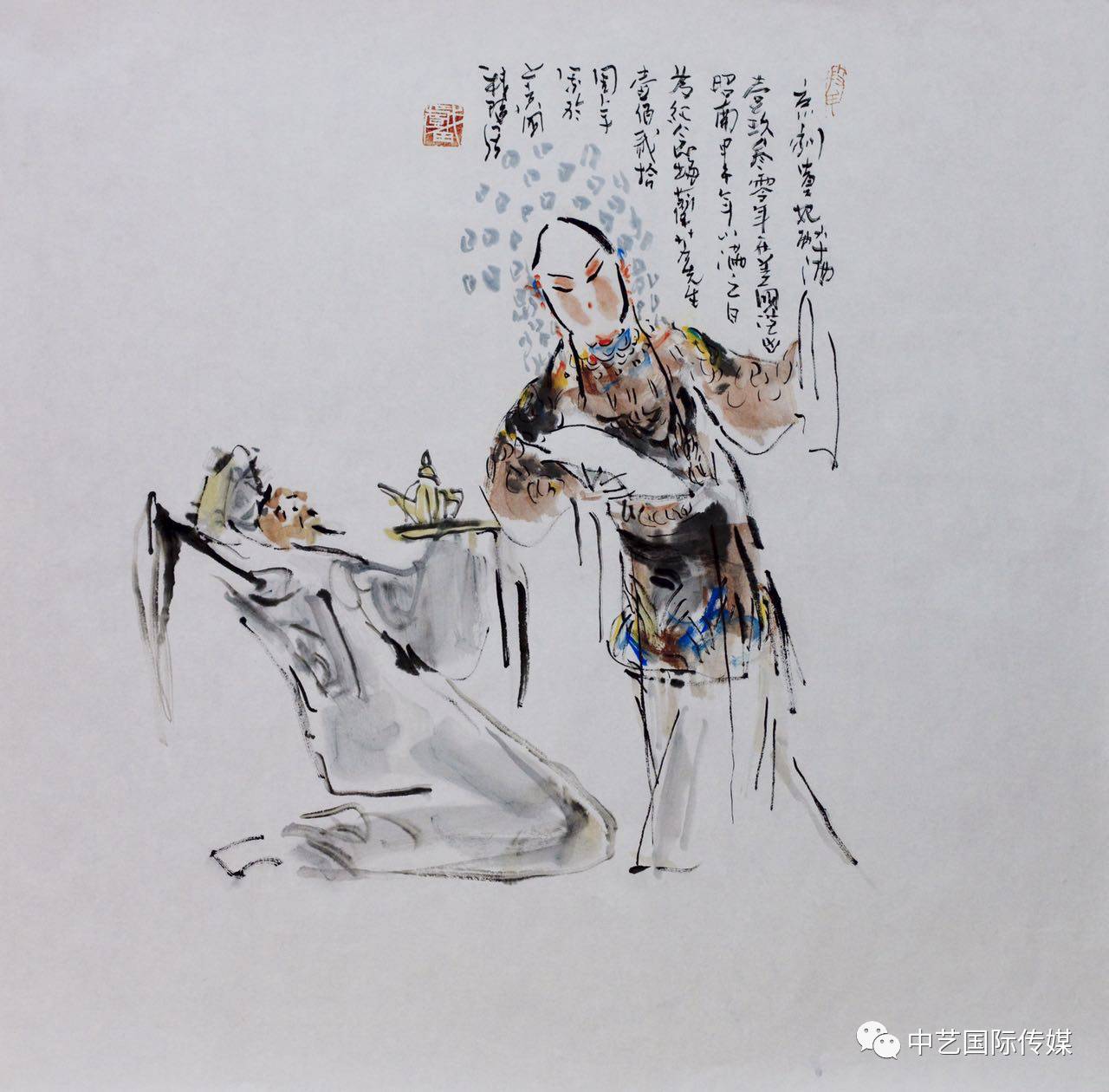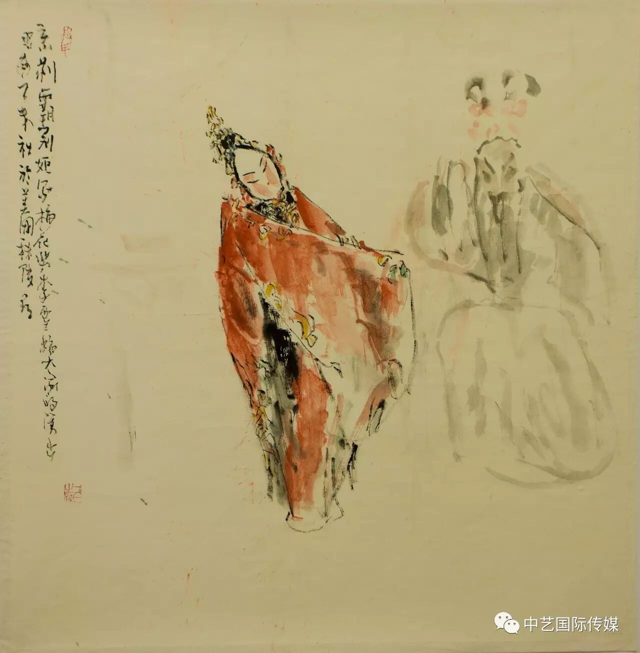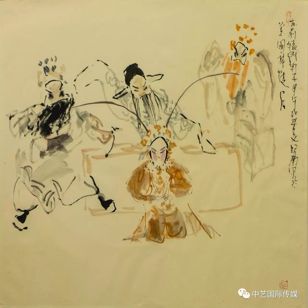 京剧《贵妃醉酒》这是我很喜欢的一幅画,梅兰芳先生改编演出这出戏已经一百年了,因为要去上海演出和他的老搭档齐如山先生怄气,也是因为他独断独行的成功,《贵妃醉酒》成为了享誉四海的经典名著。因为知道“戏”,因为知道演员,做作品的时候往往会迅雷不驻地行笔方式,并且多变的笔墨做成全画面欲止又静的情节,构成虚实明暗强烈对比的旋律振荡人性。心里有戏,落笔就处处有“声音”,画画就是这样真情实意沁人心肺的事情。