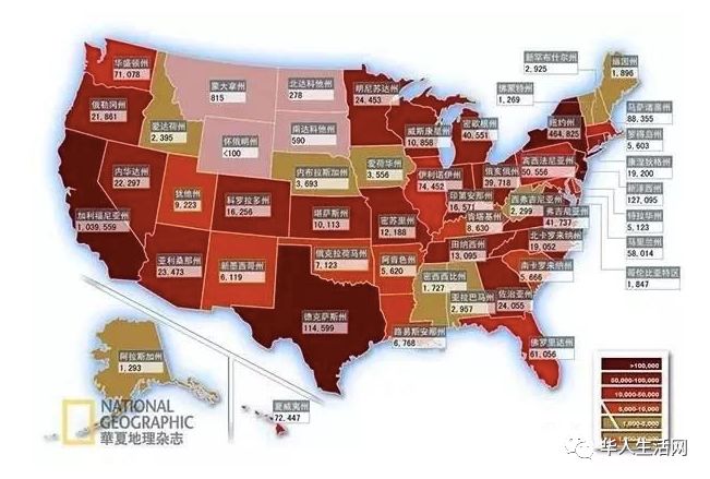 华人在美国的居住很有规律,主要是集中在加州、纽约和大都会城市。