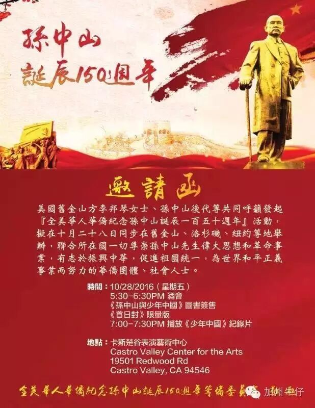 正值“孙中山诞辰150周年”,美国旧金山方李邦琴女士、孙中山后代等共同呼吁发起“全美华人华侨纪念孙中山诞辰一百五十周年”的活动,将在10月28日同步在旧金山、洛杉矶、纽约等地举行。