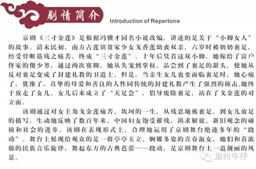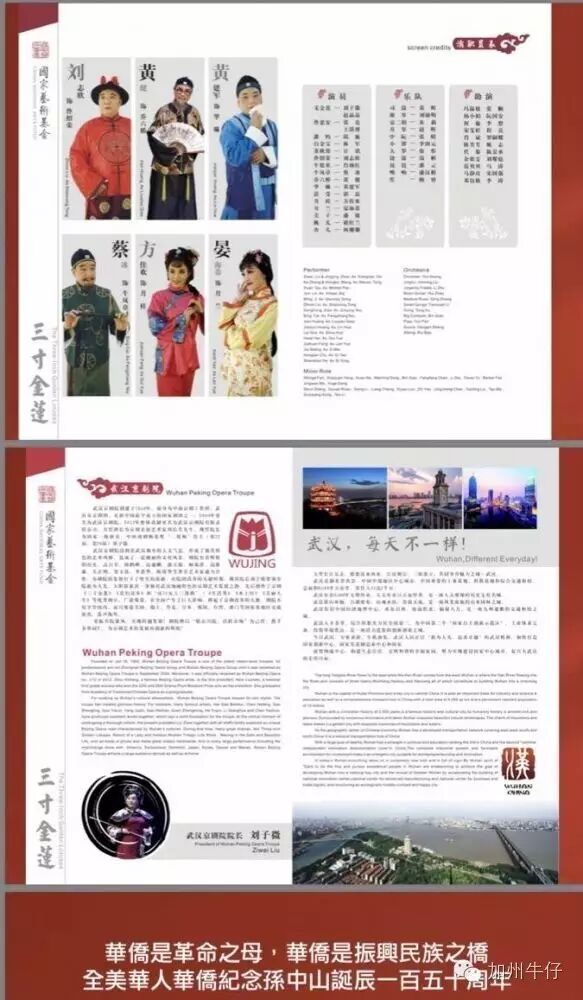 由刘薇(刘子薇)领导的中国武汉京剧院演出的,国家艺术基金资助的京剧节目《三寸金莲》,亦将作为活动内容,将于10月28日下午7点30分,在旧金山卡斯楚谷表演艺术中心(查博特学院艺术中心)隆重上演。届时,来自武汉京剧院的优秀演员们,将以失传很久的“跷功”惊艳亮相。