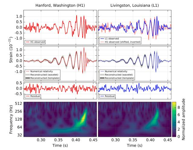 为什么我们知道是两个黑洞变成一个黑洞呢?下面我们给一个粗略的解释。单个物体的质量,可以从是通过波形的振幅和频率随时间演化所测定的。而上面第一、二个阶段的转换,可以让我们推测出每个物体的尺寸,从而断定它们都是黑洞。第三个阶段,波形的频率和衰减率可以让我们推断出最后形成黑洞的“光球”的存在和光球附近的几何结构。