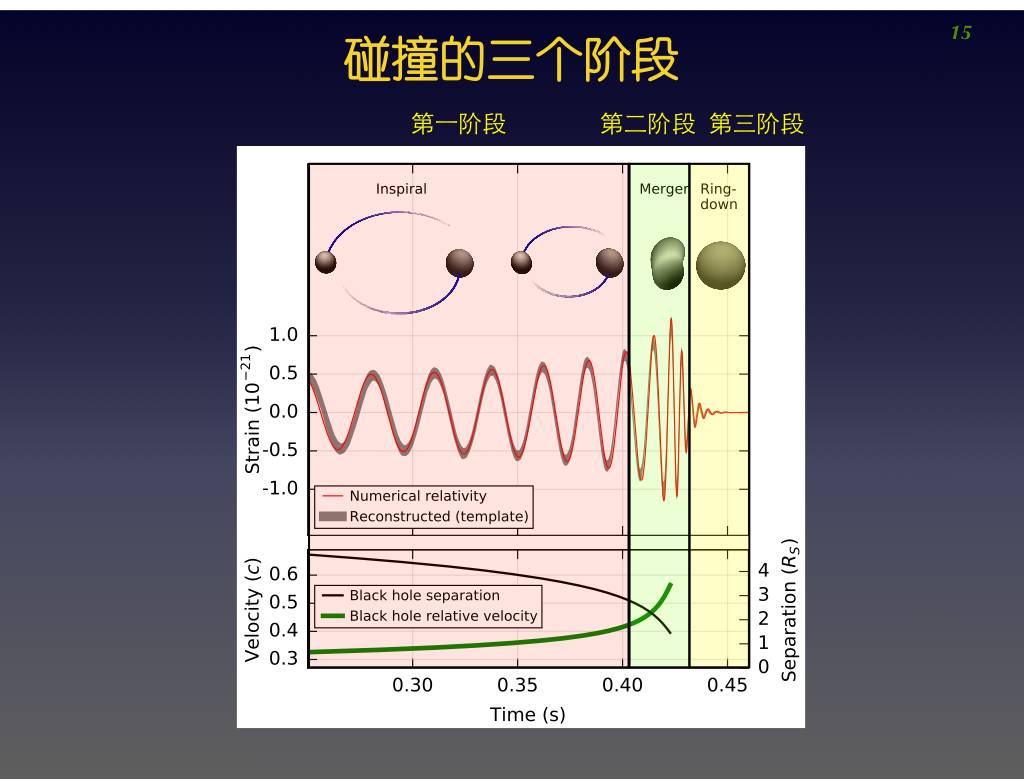 第二阶段。到两个黑洞快并合的时候,引力波频率达到100Hz,轨道频率50Hz,就是每秒钟转50圈。这个时候两个黑洞已经快形成一体了,它们每个人“中心”之间的距离大概是两百公里左右。