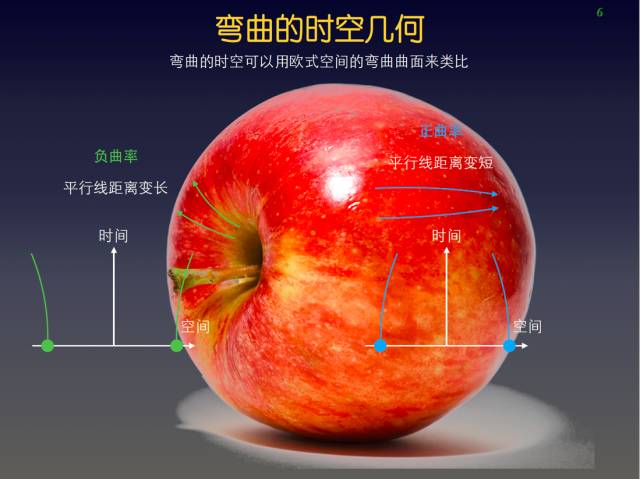 广义相对论中的时空几何,就是会让本来速度彼此平行的自由下落物体彼此接近或者远离。像牛顿引力中的苹果落地一样,广义相对论中的弯曲几何也可以用苹果解释。在苹果的表面,如果画一些起初平行的曲线,并且以同样的初速度从这些平行曲线出发。那么根据这些平行曲线的位置和走向不同,它们有的会彼此靠近(正曲率),有的会彼此远离(负曲率)。