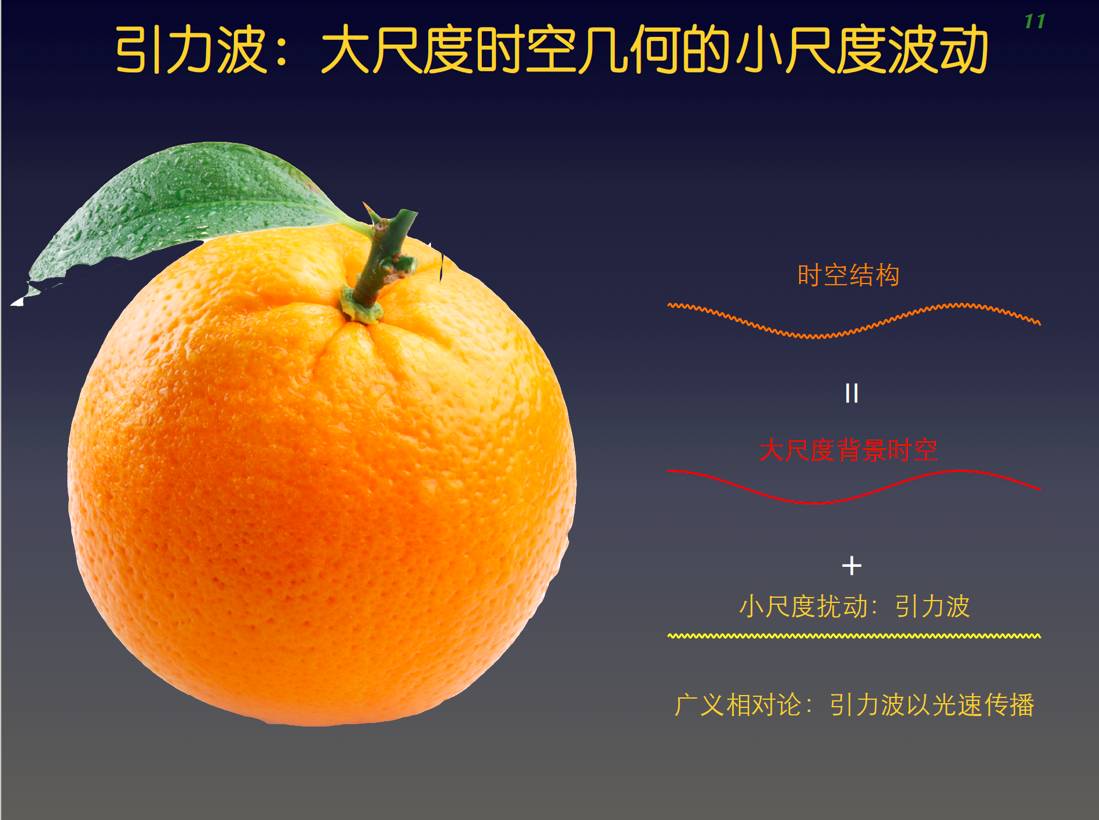 想了解引力波所对应的时空几何,需要把刚才光滑的苹果变成粗糙的橘子:橘子表面有两种弯曲的几何结构。大尺度的时空几何(橘子的半径)代表了宇宙空间中的引力,而小尺度的几何(粗糙的点点)代表了引力波。