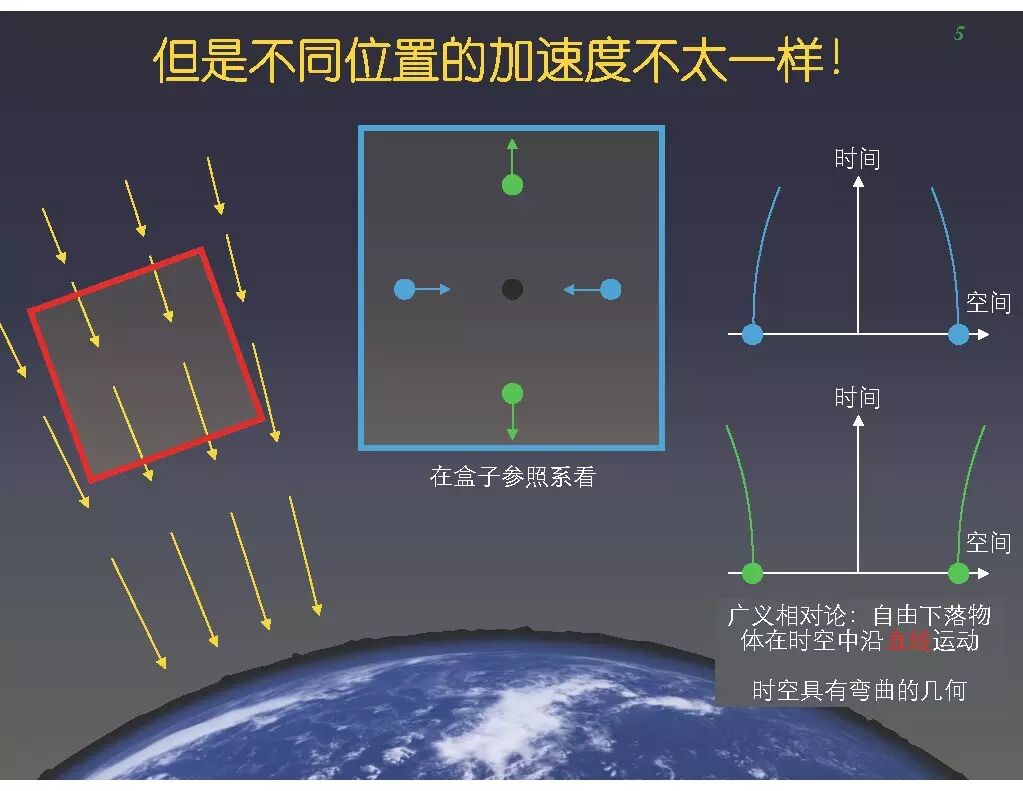 如果我们进入自由下落的参照系,引力好像没有了,是不是意味着引力只是参照系变换的产物,而不是真实的物理存在呢?不是的,因为宏观上不同位置上自由下落的参照系是不同的!如果我们考虑一个足够大的空间站,就会发现空间站不同位置上的物体会有相对加速的现象,这就是所谓的潮汐加速度。而这个加速度,是对所有物体都适用的。爱因斯坦把这个归结于时空几何的弯曲。