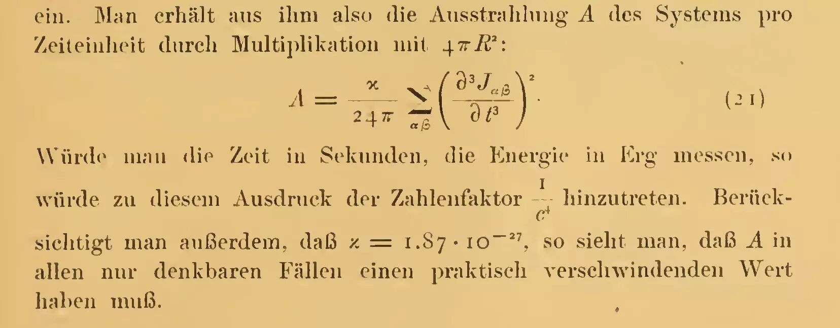 爱因斯坦在1916年就预言了引力波的存在: 他发现自己的方程有一组解,和电磁波的性质类似,以光速传播。但是他在文章里又说(下图中最后一句),因为这个引力波辐射的能量很少,在所有能想得到的情况下,引力波的辐射都可以被忽略。