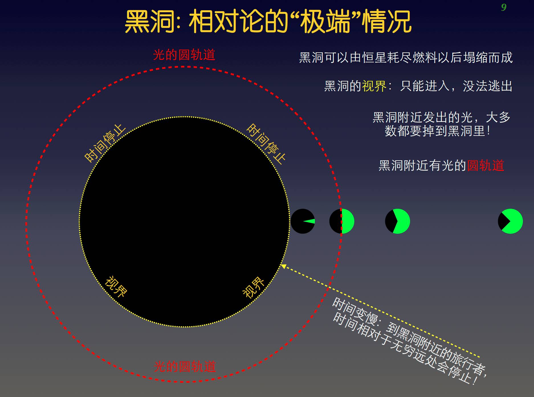 在数学上,黑洞的时空有很多奇妙的结构。比如,黑洞有一个叫做“视界”的结构。在“时空图”上,视界把时空分成两部分,一部分是可以和远处联系的,而另一部分,是无法和远处联系的。当星体塌缩成黑洞时,坐在星体表面的观测者会穿过黑洞的视界,而站在外面的观测者,则不会看到星体表面的观测者穿过视界,只是看到他的运动越来越慢,像是被“冻结”在视界表面。
