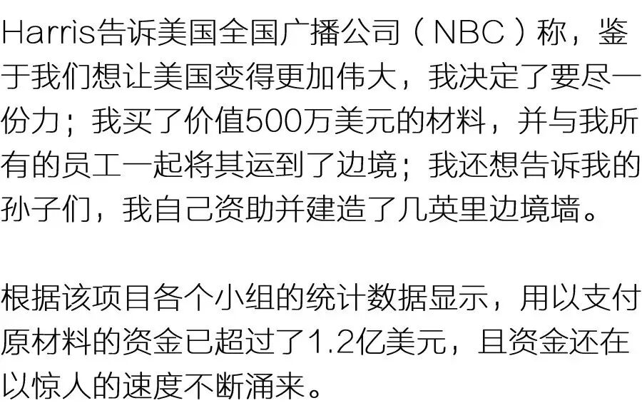 汇通网还援引外媒报道称,像圣安东尼奥的工程师和Harris-TEXCON(财富榜500强建筑公司联营店)业主等一些商业人士则表示,他们已决定拿出自己的钱来资助修建边境墙的事业。