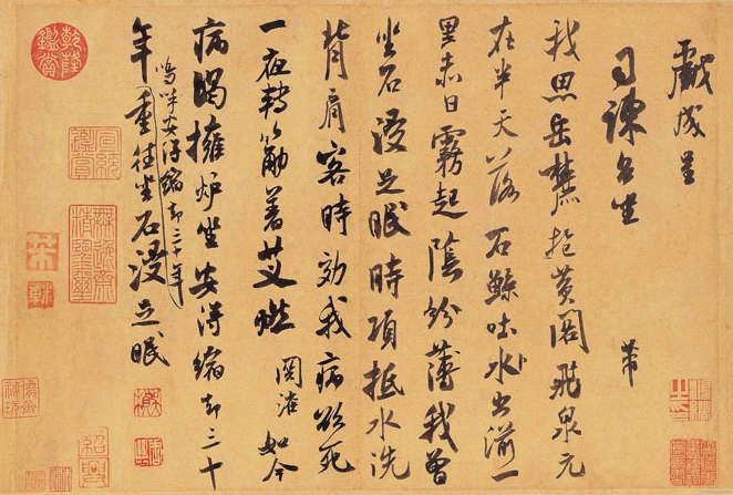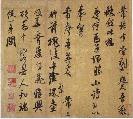 释文:芾非才当剧,咫尺音敬缺然,比想庆侍,为道增胜,小诗因以奉寄。希声吾英友。芾上。竹前槐后午阴繁,壶领华胥屡往还。雅兴欲为十客具,人和端使一身闲。