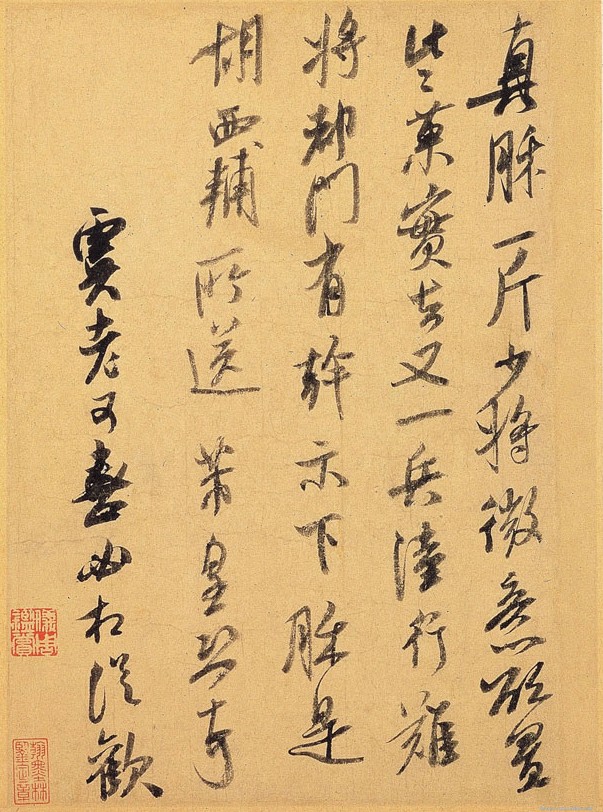 释文:真????一斤,少将微意,欲置些果实去,又一兵陆行难将。都门有干示下,是胡西辅所送。芾皇恐顿首。虞老可喜,必相从欢。