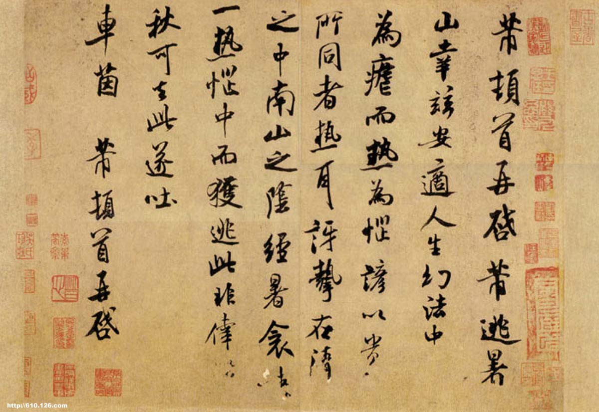 释文:芾顿首再启。芾逃暑山,幸兹安适。人生幻法,中□为虐而热而恼。谚以贵□所同者热耳。讶挚在清□之中,南山之阴。经暑衾□一热恼中而获逃,此非幸□。秋可去此,遂吐车茵。芾顿首再启。