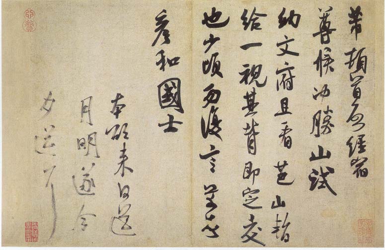 释文:芾箧中怀素帖如何。乃长安李氏之物。王起部、薛道祖一见。便惊云。自李归黄氏者也。芾购于任道家。一年扬州送酒百馀尊。其他不论。帖公亦尝见也。如许。即并驰上。研山明日归也。更乞一言。芾顿首再拜。景文隰公阁下。