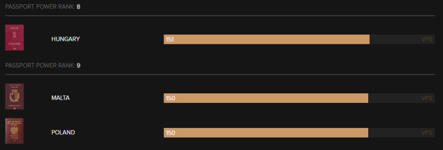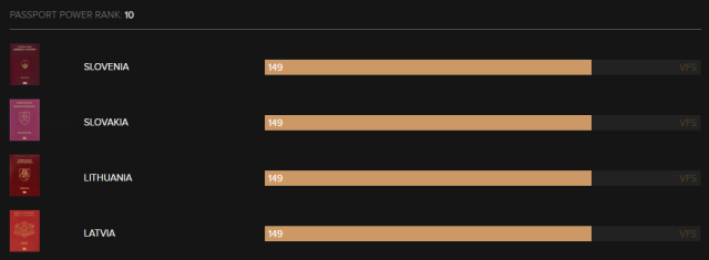 马耳他和波兰排名第9,可免签149个国家; 斯洛文尼亚、斯洛伐克、立陶宛、拉脱维亚排名第10,可免签148个国家。