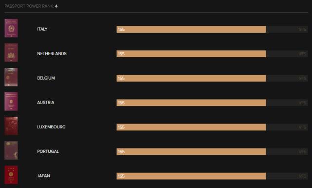 意大利、荷兰、比利时、奥地利、卢森堡、葡萄牙和日本并列第4,获154个国家免签。