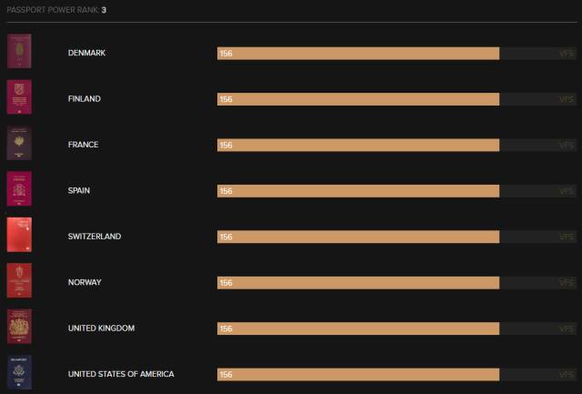 在这次最新排名中,前10名中大部分是欧洲国家。丹麦、芬兰、法国、西班牙、瑞士、挪威、英国和美国排名并列第3,可获得155个国家免签。