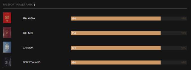 马来西亚、爱尔兰、加拿大和新西兰并列第5,获153个国家免签。