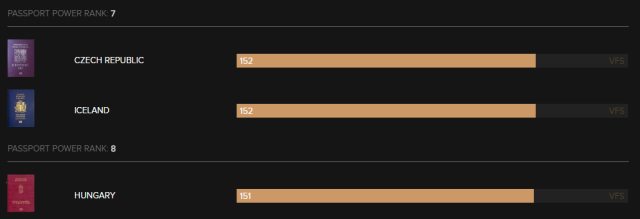 捷克共和国、冰岛并列排名第7,获151个国家免签;匈牙利获150个国家免签,排名第8。