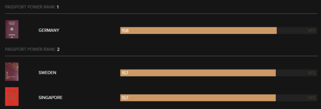 持有德国护照者可以免签证前往全球范围内218国中的158个国家或地区旅游。值得注意的是,新加坡护照与瑞典在此次全球排名中位居第2(157国免签),和第一名的德国仅1国之差,同时也成为亚太区流动自由度最高的护照。