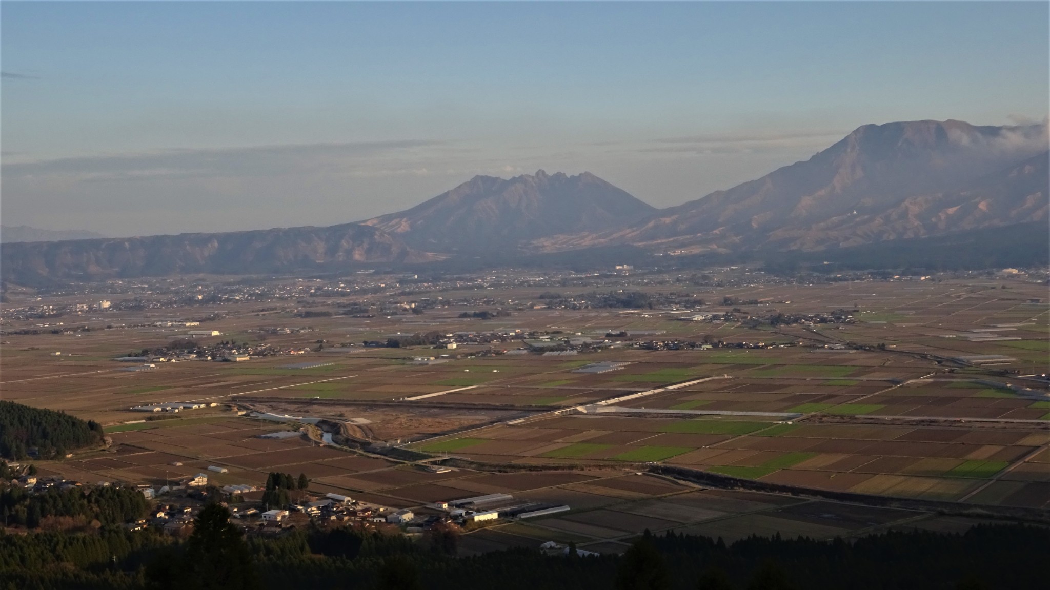 下面几张照片是在大观峰观景台拍的,这里是不错的观看阿苏火山的地方。不仅有连绵的阿苏山,又同时俯瞰盆地中的农家 和田 地。