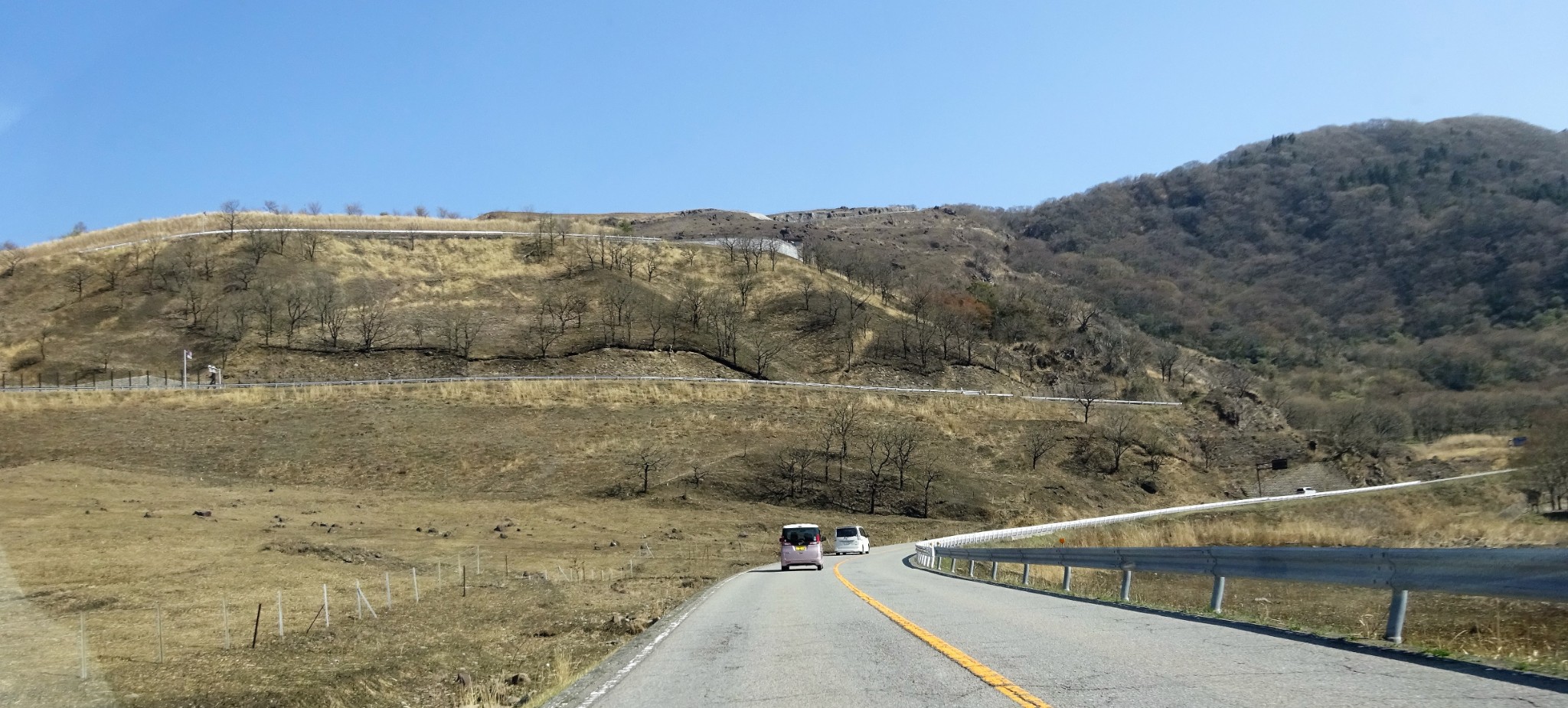 Makinoto Pass位于连接别府和阿苏的Yamanami高速公路的最高点。 由于它是一条受欢迎的山路的入口,可以看到许多登山者来这里爬山。