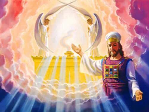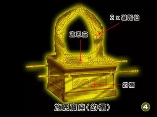 约柜的盖子称作“施恩座”。(出25:17)约柜上方两边是遮掩的基路伯,或称天使。耶和华荣耀的光辉,或者说是“上帝显现时的光芒之云(Shekinah舍吉那)”(字面上的意思是 “住所”)就是从他们中间发出。这是上帝宝座和天上全能者临格的象征。至圣所的墙壁上刻有许多天使,代表着环绕天上上帝的天使之云。(王上6:29)