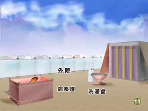 燔祭坛与会幕之间立着洗濯盆。它也是用黄铜制成,盛满水,用于祭司的洗濯自洁。
