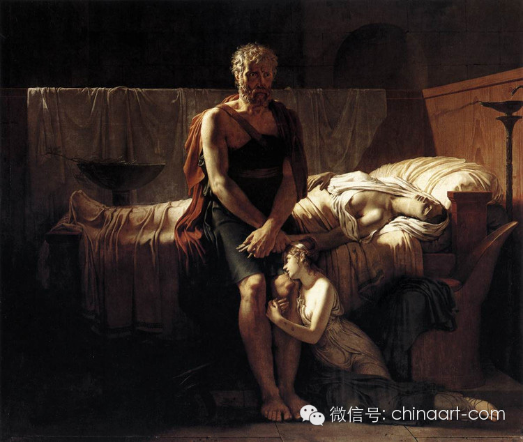 【小编有话】这是一个虚构的历史悲剧故事的形象化表现:经过多年流放生涯的Sextus 回到家里时,他的妻子已经死去,他心如死灰的坐在妻子的尸体旁边,两眼茫然的盯着不知什么地方,心中思考着生命的意义。当时是一个没有上帝信仰的时代,这幅作品暗示了基督耶稣对人生的思考,而悲痛万分地抱着父亲大腿痛哭的女儿,正是基督教艺术中常见的抹大拉的玛利亚(Mary Magdalen)的化身。