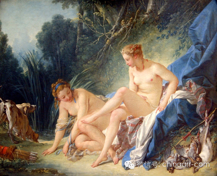 【小编有话】布歇是路易十五的宫廷画家,这幅作品是公认的洛可可艺术(Rococo)的代表作。在这幅作品中,罗马神话中的女神戴安娜,被表现为一个贵族小姐。