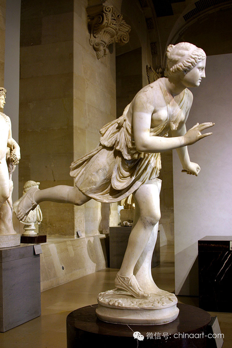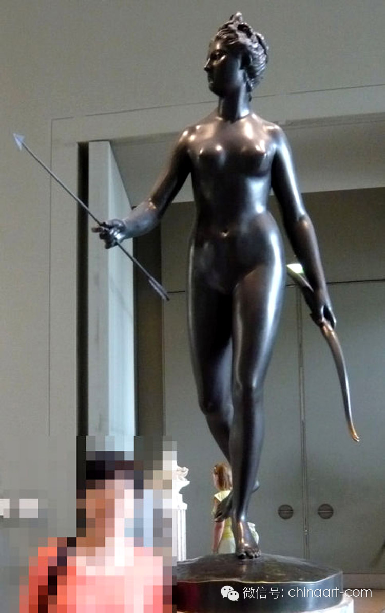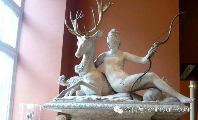 【】罗马神话中的戴安娜,对应于希腊神话的阿耳忒弥斯(Artemis):宙斯的女儿,狩猎女神,月亮女神,奥林匹斯山上的12主神之一。关于戴安娜的雕塑作品非常多,这件作品可能是最著名的一件。 这件雕塑中,戴安娜的圣兽,一只梅花鹿,跟随着她,她的一只手正在从背着的箭筒里抽出一支箭。