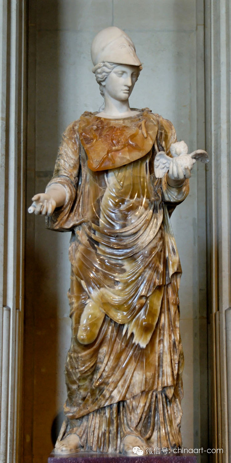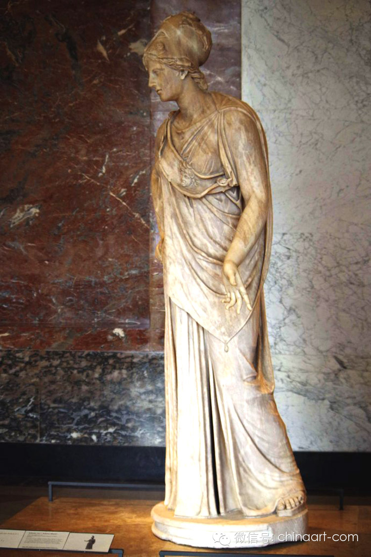 《Mattei 的雅典娜(Mattei Athena)》,原作是公元前4世纪希腊雕塑家Cephisodotos 或者Euphranor 的作品,这是公元一世纪的罗马复制品,类似于青铜雕塑作品《PiraeusAthena》。这件作品很高:2.3 米。