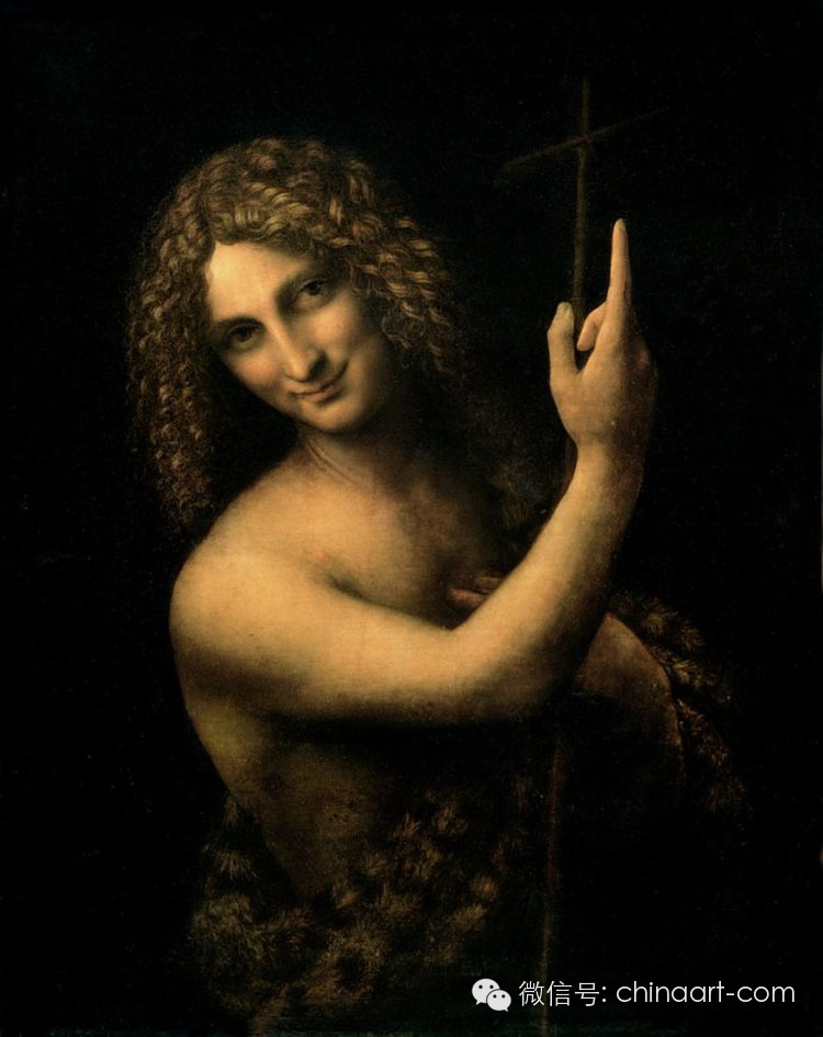 【小编有话】画面上,圣约翰上身裸露,几乎整个身子没入黑暗中。他一手拿着十字架,一手指向天空,脸上露出狡黠而神秘的微笑。画中的圣约翰的脸庞线条都显得异常柔和,甚至说妩媚也不为过,简直男女莫辨。有人说,这是以画家钟爱的男模特为原型的。我把它称之为“男版的神秘的微笑”。
