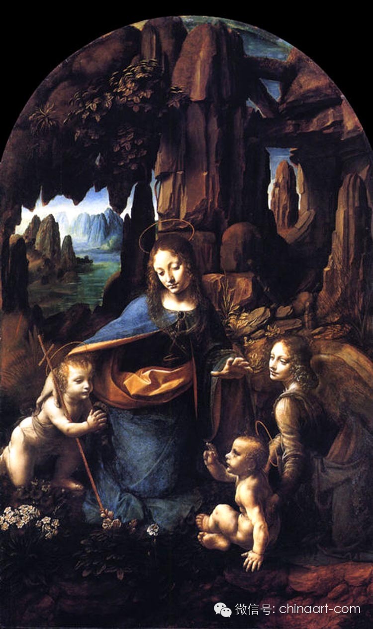 【小编有话】此 画是列奥纳多·达·芬奇应一宗教团体之请而为米兰的圣弗朗切斯科教堂的一间礼拜堂作的祭坛画。此画以圣母居图中央,她右手扶婴孩圣约翰,左手下坐婴孩耶 稣,一天使在耶稣身后,构成三角形构图,并以手势彼此响应,背景则是一片幽深岩窟,花草点缀其间,洞窟通透露光。此画虽属传统题材,然表达手法和构图布局 皆表明达芬奇的艺术水平之高深。人物,背景的微妙刻画烟雾状笔法的运用,科学地写实以及透视,缩形等技术法的采用,表明了他在处理逼真写实和艺术加工的辩 证关系方面达到了新的水平。