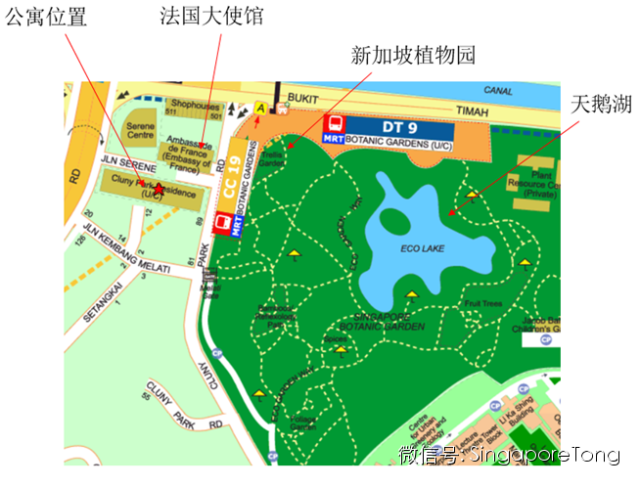 Cluny Park Residence公寓坐落于新加坡高尚住宅区Bukit Timah和新加坡植物园交汇处,与法国大使馆一墙之隔。这个永久地契的公寓,对面就是新加坡最好的公园-新加坡植物园的入口。地铁站的入口也在这里。闲暇时刻,走几步,可以来到公园里的天鹅湖旁观赏天鹅。再走几步,穿过植物园,就是乌节路了。