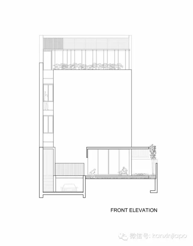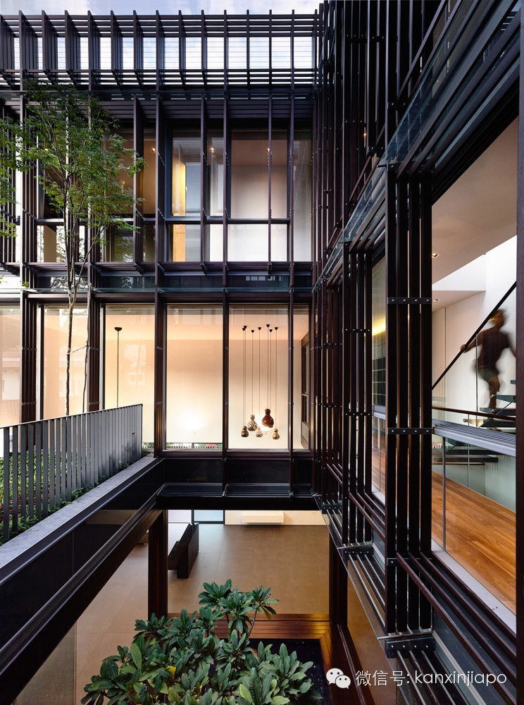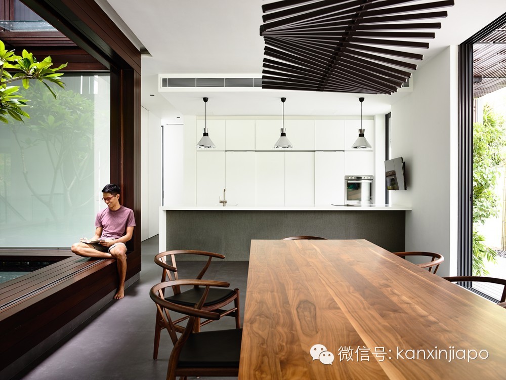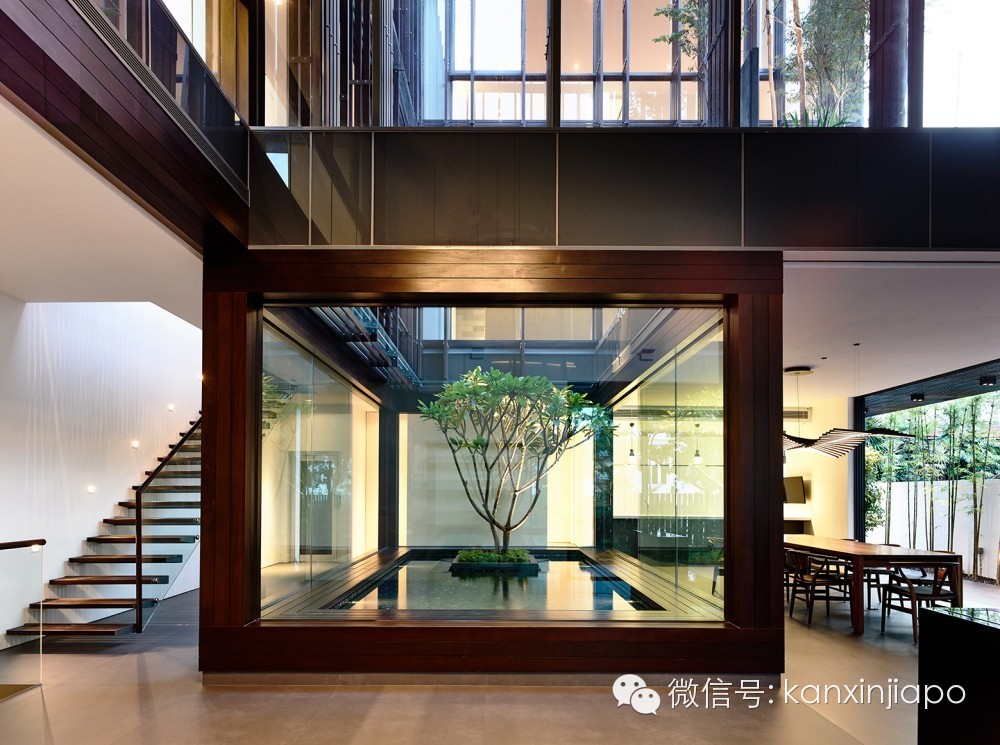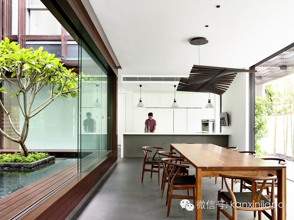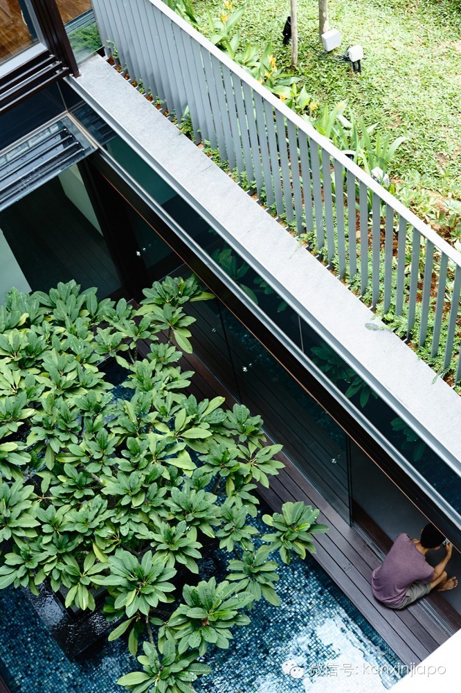 来自建筑师的描述:位于半独立住宅的中央庭院分布在两个楼层上。在首层庭院, 鸡蛋花树位于池塘的中央,池塘四周是木材饰面的框架。两倍大的客厅和餐厅围绕着这个庭院。