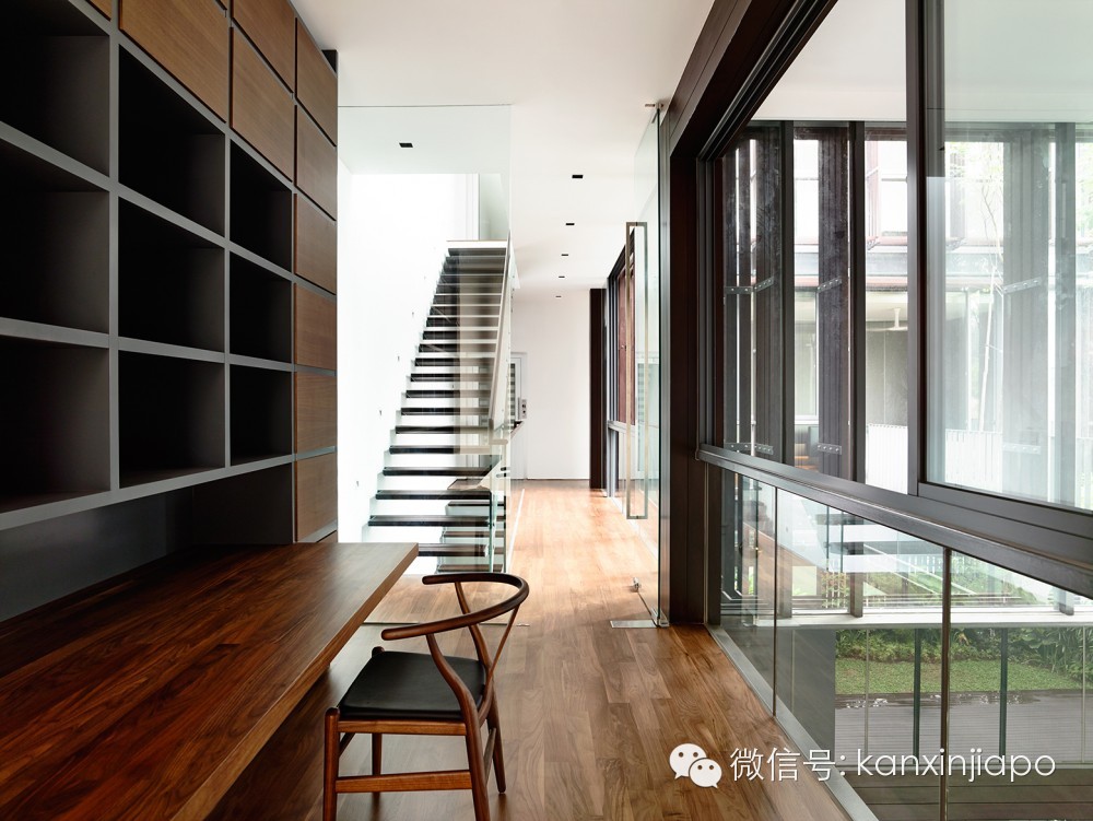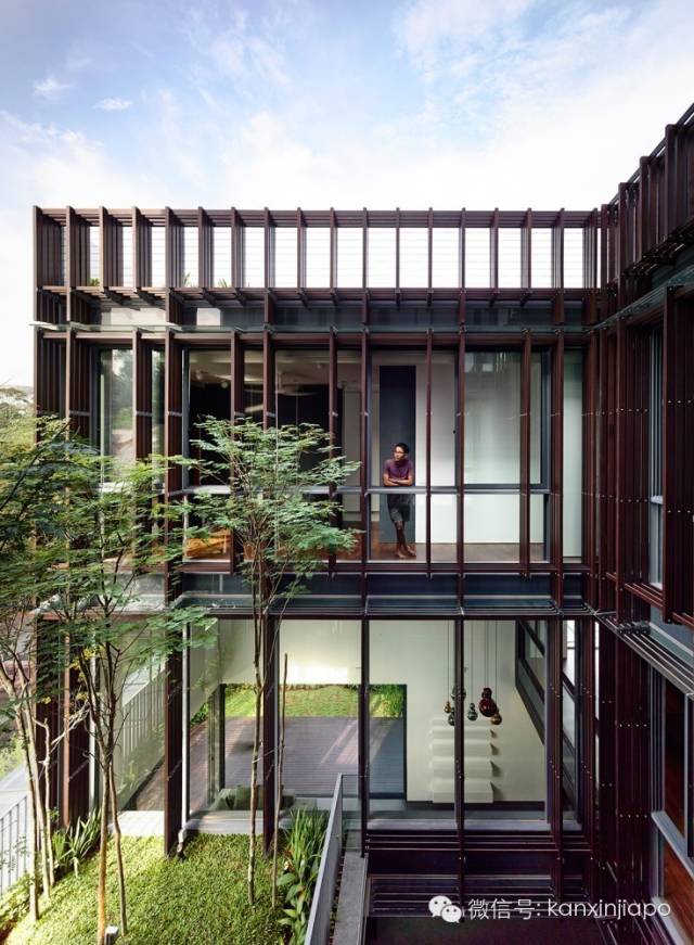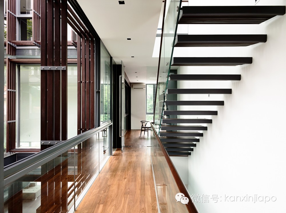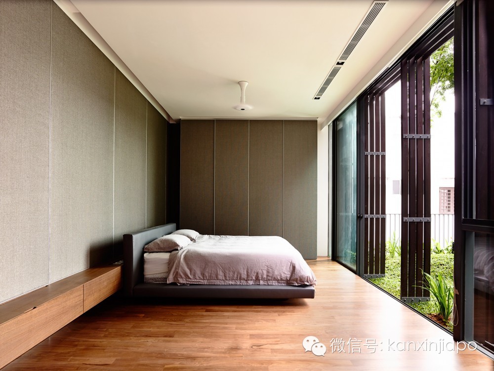 二层的庭院位于一层餐厅的正上方,二层主卧的前方。面向庭院的立面为通高的玻璃,玻璃外面安装有层叠咬合的垂直和水平木条。