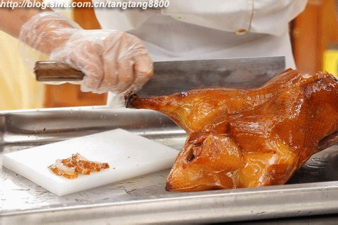 北京烤鸭吸引食客的秘密,是其甜美而光泽鲜明的脆皮。人们将烤鸭在炉中慢慢翻转烘烤,烤出甜美多汁的脆皮,地道的食客会多吃皮,少吃肉,用小薄饼卷上,再配以葱段和海鲜酱或甜面酱,令人爱不释口。