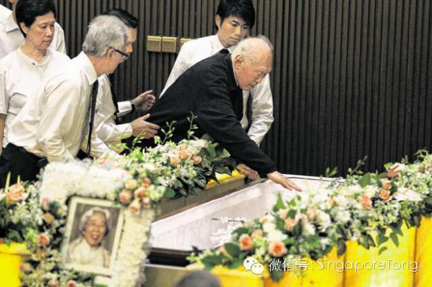 2010年10月6日,在送别爱妻柯玉芝的最后一刻,李光耀将深红色玫瑰放入棺中,两次吻别夫人,再伸手轻抚她的额头。