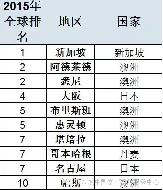 在 2015年最新的外派员工城市居住调查报告中,新加坡继续稳踞16年来全球第一名的宝座。日本城市成绩也不错,大阪、名古屋、东京、横滨紧随其后。香港虽 然仍维持亚洲第6名,但或因去年某事件,全球排名下降16个名次,成为全球第33名。上海和北京分别为全球110名和122名。报告由人力资源管理顾问机 构ECA International发表,ECA是透过知识、信息及科技协助全球企业管理外派人才,此份报告针对外派员工生活环境进行调查。