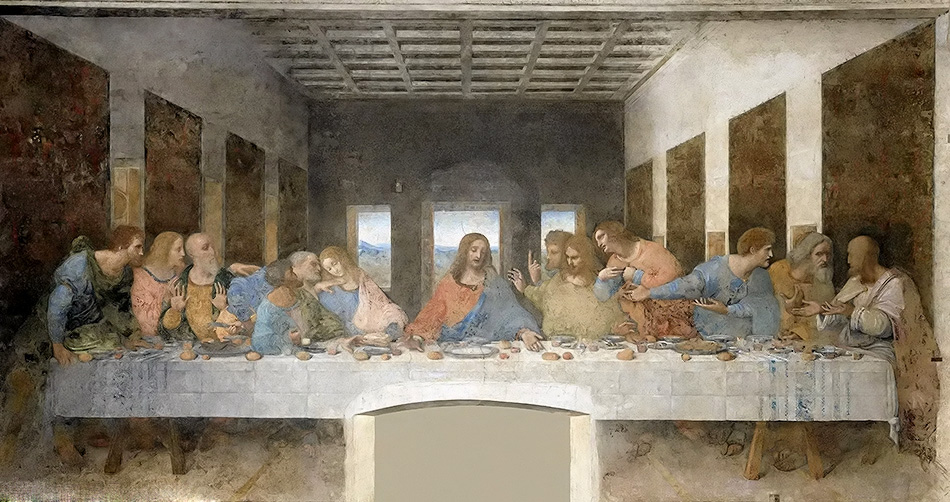 壁画《最后的晚餐》无可争议地成为世界美术宝库中最完美的典范杰作。这幅画,是画家达芬奇直接画在米兰一座修道院的餐厅墙上的。沿着餐桌坐着十二个门徒,形成四组,耶稣坐在餐桌的中央。他在一种悲伤的姿势中摊开了双手,示意门徒中有人出卖了他。该画尺寸是421X903厘米,画面利用透视原理,使观众感觉房间随画面作了自然延伸。为了构图使图做得比正常就餐的距离更近,并且分成四组,在耶稣周围形成波浪状的层次。越靠近耶稣的门徒越显得激动。耶稣坐在正中间,他摊开双手镇定自若,和周围紧张的门徒形成鲜明的对比。耶稣背后的门外是祥和的外景,明亮的天空在他头上仿佛一道光环。他的双眼注视画外,仿佛看穿了世间的一切炎凉。
