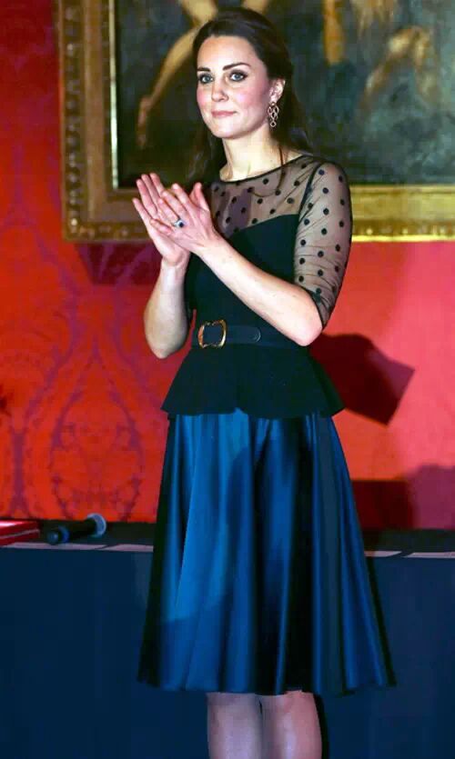 ▼王妃出席伦敦肯辛顿宫的慈善活动“Place2Be”,她身着Hobbs黑色圆点透视荷叶边上衣,搭配Jenny Packham午夜蓝裙子。腰间的黑色宽腰带遮挡身孕,看上去依旧纤细苗条。