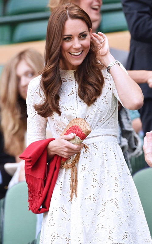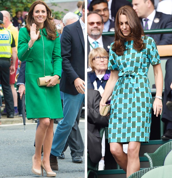 (右图)2014年7月6日,在温布尔登网球锦标赛赛场,凯特王妃身穿Jonathan Saunders编织图案连衣裙。