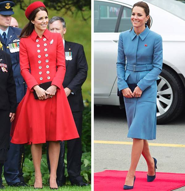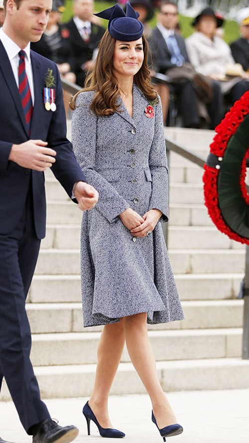 (右图)王妃身穿浅蓝色Alexander McQueen大衣,出席新西兰布伦海姆一战百年纪念仪式。