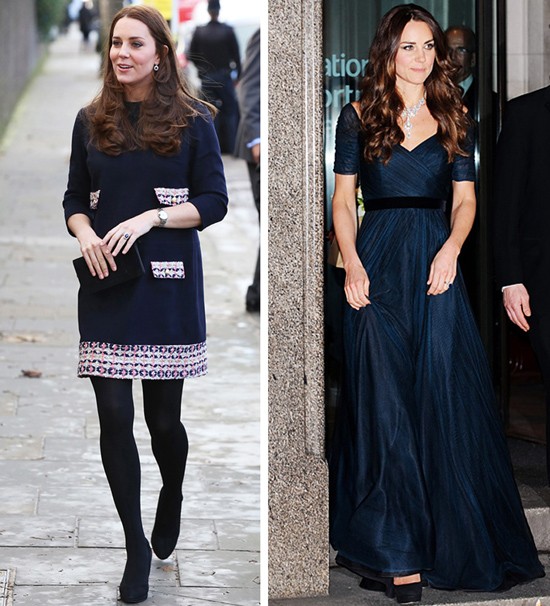 (右图)去年在英国国家肖像馆举办的慈善晚会中,身穿一袭Jenny Packham墨蓝色礼服的凯特王妃,佩戴着伊丽莎白二世女王的钻石项链盛装出席。