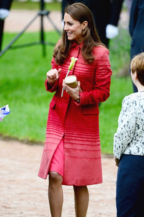 ▼凯特王妃与威廉王子访问苏格兰,红色总能衬得她高贵妩媚。她身穿Jonathan Saunders红色外套,搭配同色Goat连衣裙和Celtic胸针,还有她最爱的L.K. Bennett高跟鞋。