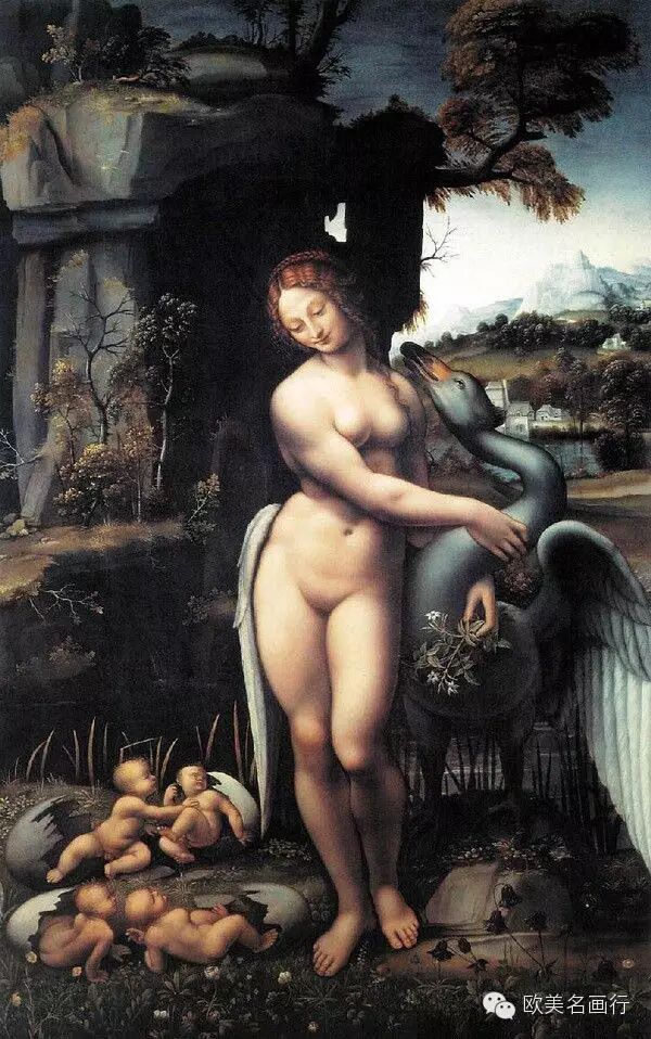 3、丽达与天鹅 达芬奇 意大利 木板油画 1506年 73.7x69.5cm