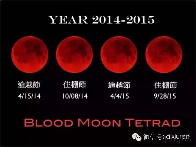 两年中有四次血月的发生,而这四次血月又正好发生于以色列人的逾越节和住棚节,此两个节日是耶和华神规定他们一年当中要守的第一个节期和最后一个节期。这样的天象于以色列节期相遇的巧合,其发生的概率是非常的低再过去的五百多年,仅仅发生过三次。再过去的五百多年,仅仅发生过三次,下次要一百年之后了。