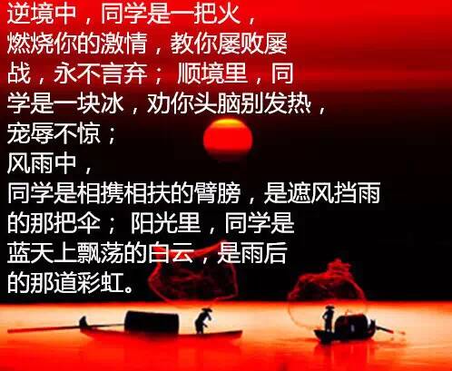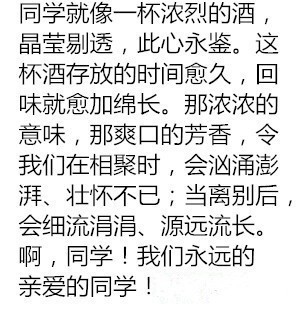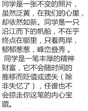 同学,就是亲爱的兄弟姊妹,是精神上的血亲; 同学是一种别样的情,有永远说不完的话、叙不完的旧、道不尽的喜悦、诉不完的忧愁;就算有一天沧海变成桑田,那些笑或泪、共同的画面,也会永远留在我们心里,不会改变。