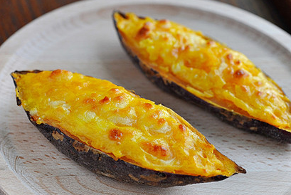 5、把搅拌好的红薯肉酿回红薯托中,表面可以再撒一些芝士碎