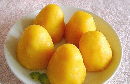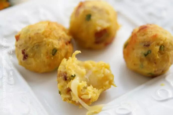 8、取约乒乓球大小的红薯泥,中间包入马苏里拉奶酪球。